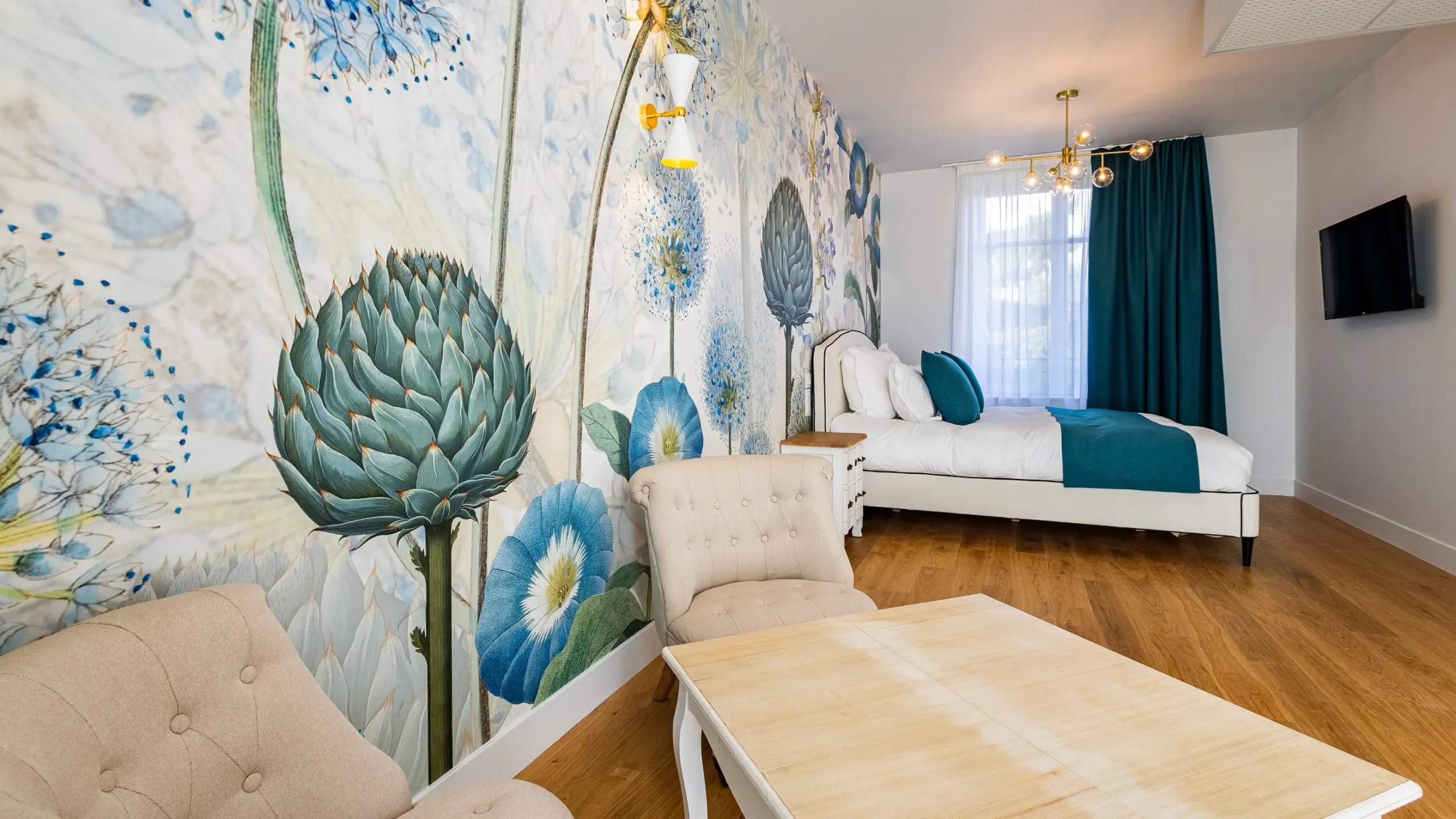 Like a breath of renewal, this white and blue room, adorned with floral patterns, captures the fresh and vibrant spirit of spring. Its baroque furniture, transports you to an elegant and romantic atmosphere.